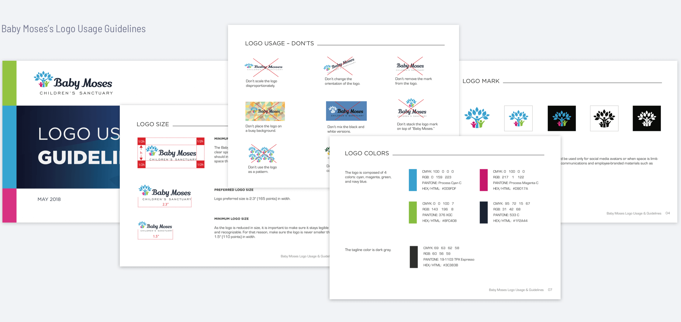 I created a style guide for the approved and finalized logo. The document provided clear instructions to ensure the correct logo usage for optimal visual performance. The guide included the logo specifications, approved logo version in color and monochrome variations, examples of incorrect usage like stretching, altering, incorrect logo placement, etc.