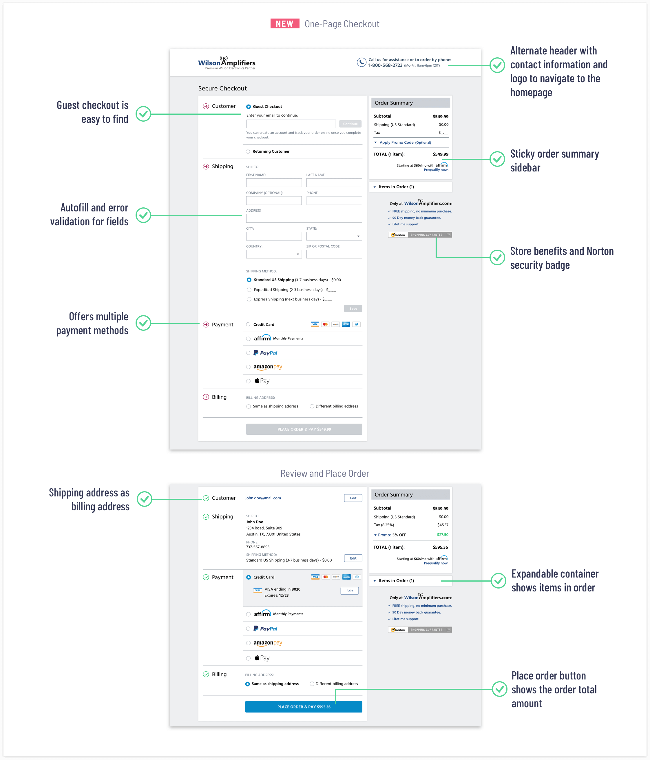 I had several meetings with the developers to make sure I was aware of any technical limitations. WilsonAmplifiers used the BigCommerce platform for their eCommerce store implementation. The BigCommerce platform offered several checkout templates. Developers and I discussed a possibility to design and implement a custom shopping cart and checkout solution. However, due to a tight schedule, we agreed to use one of the BigCommerce templates, but rework and refine it, so the shopping cart and checkout experience would be more in line with our audience needs and the company’s business goals.