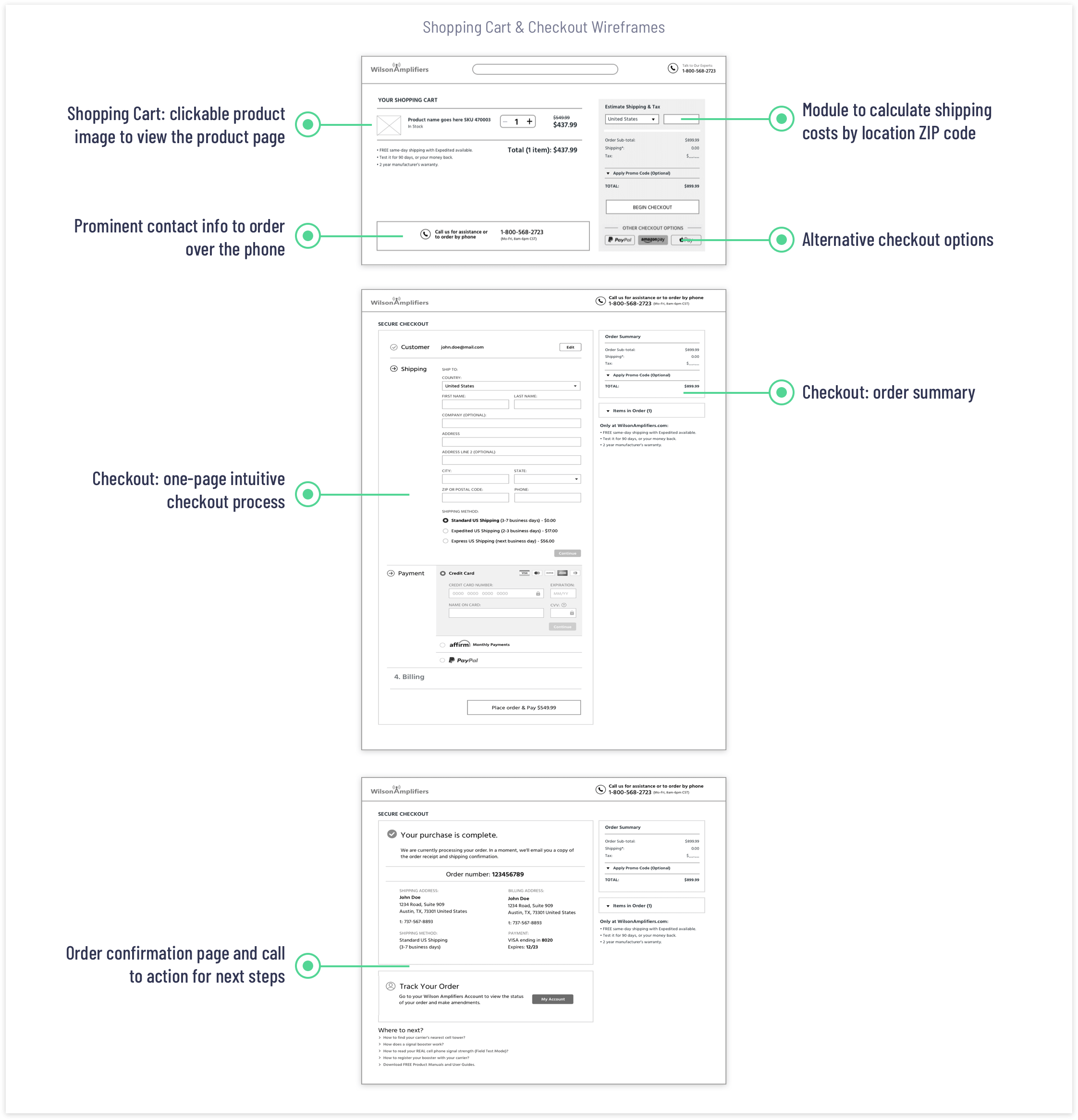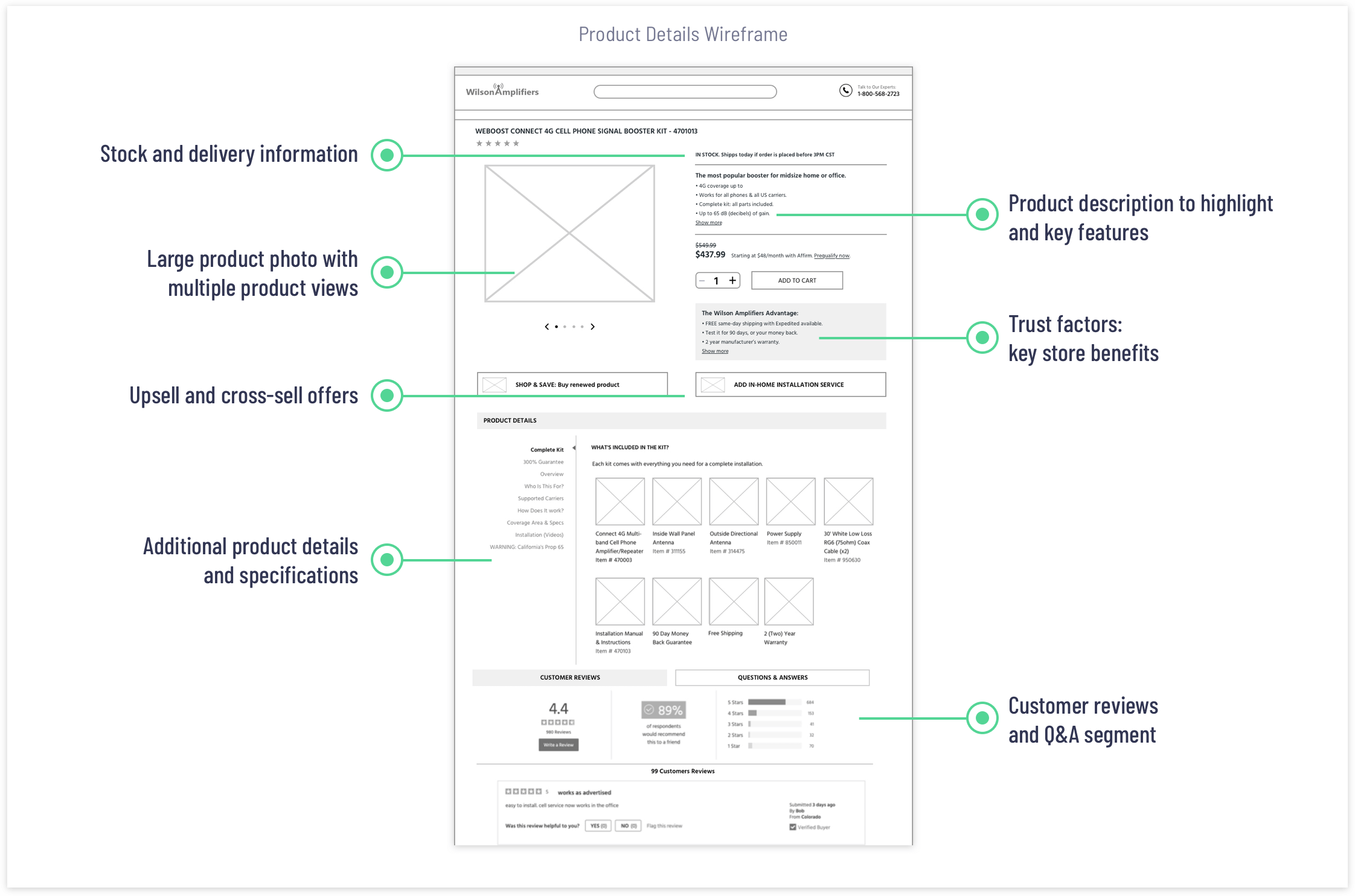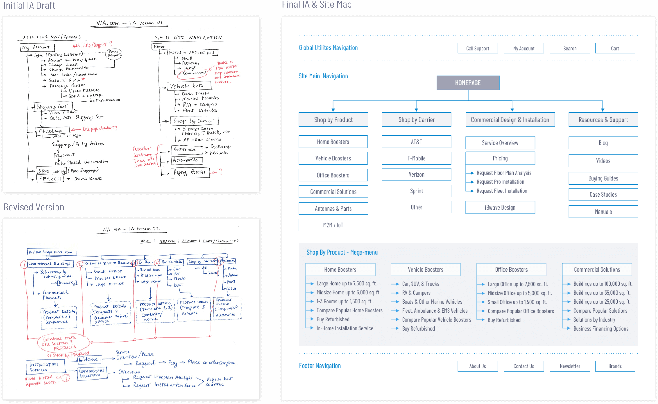 A series of kick-off meetings with the stakeholders helped me to understand the business objectives and the company’s values, such as excellent customer service, reliable products, and competitive pricing. One of the key goals was to minimize the number of calls to the call center. Customers should be able to easily find and choose the right product based on required cell phone signal coverage capacity and effortlessly complete the purchase online.