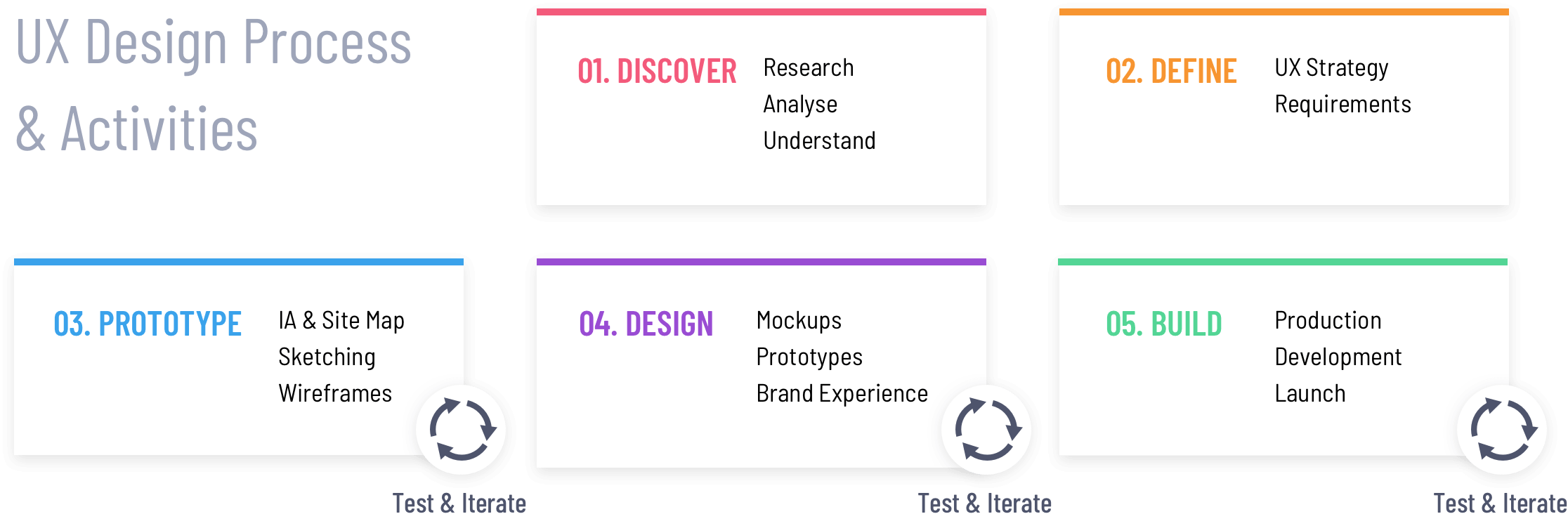For the site redesign, I proposed using a Discover-Define-Design framework with continuous testing, validation, and iterations.