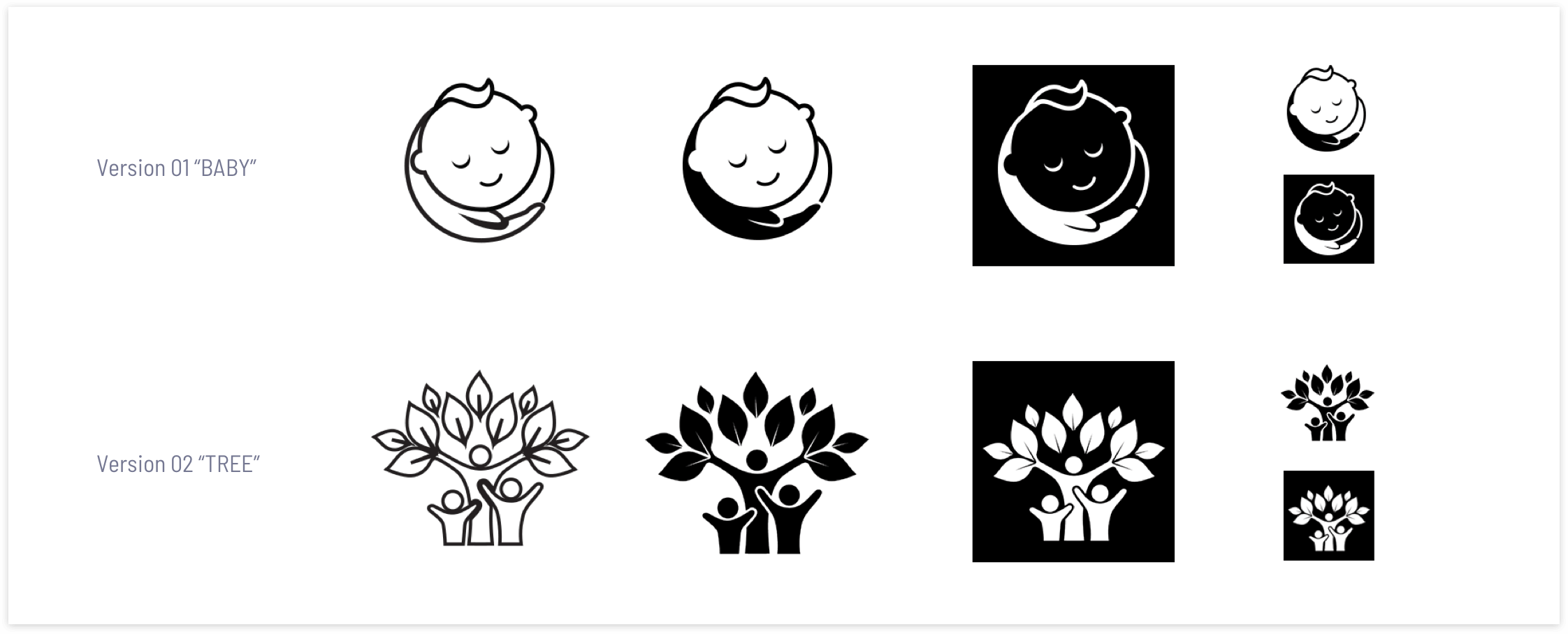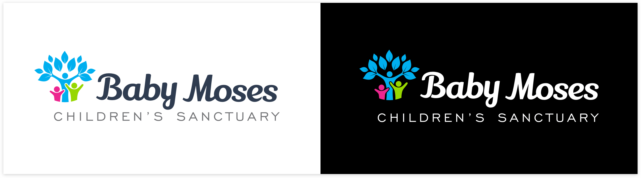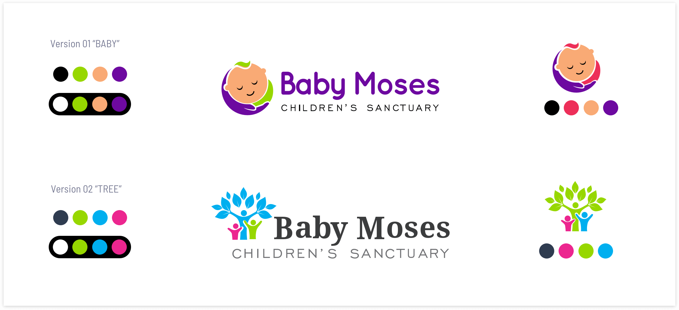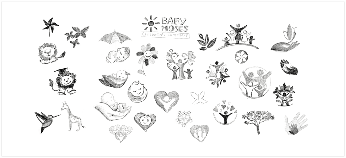 I selected two strong concepts: one was a ‘sleeping baby cradled in a hand’ to represent baby Moses, and the other idea was a ‘tree’ image that symbolized a caring and protective family. I went ahead with designing the logo mark in Adobe Illustrator. I worked in black & white mode to make sure the logo mark would be adaptable and worked well in monochrome and various sizes.