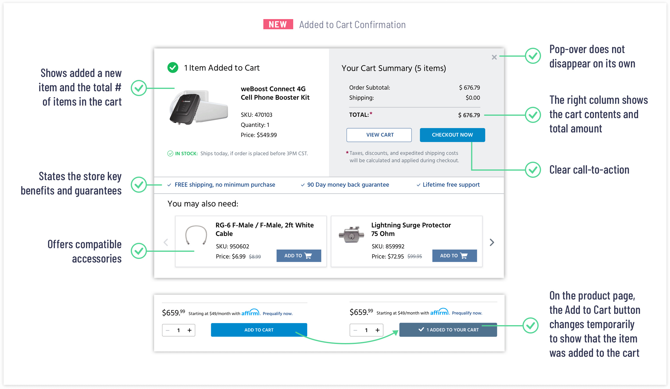 Adding an item to a shopping cart is an important step in the checkout process. To prevent shopping cart abandonment, it is important to give a confirmation message each time a customer adds an item to his/her cart. Without the confirmation, a customer may leave to look if an item has been added to the shopping cart or not. It is also useful to show the cart subtotal and provide clear calls to action. The old checkout process had the 'Added to Cart' confirmation pop-over, but there were several usability issues that I corrected in the revised design.