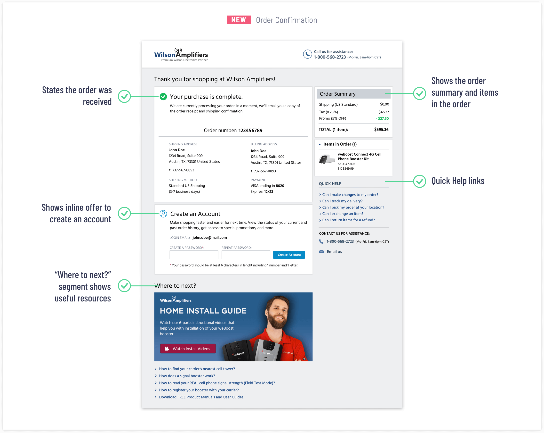 - Show order confirmation page, offer helpful information, and outline the next action steps.