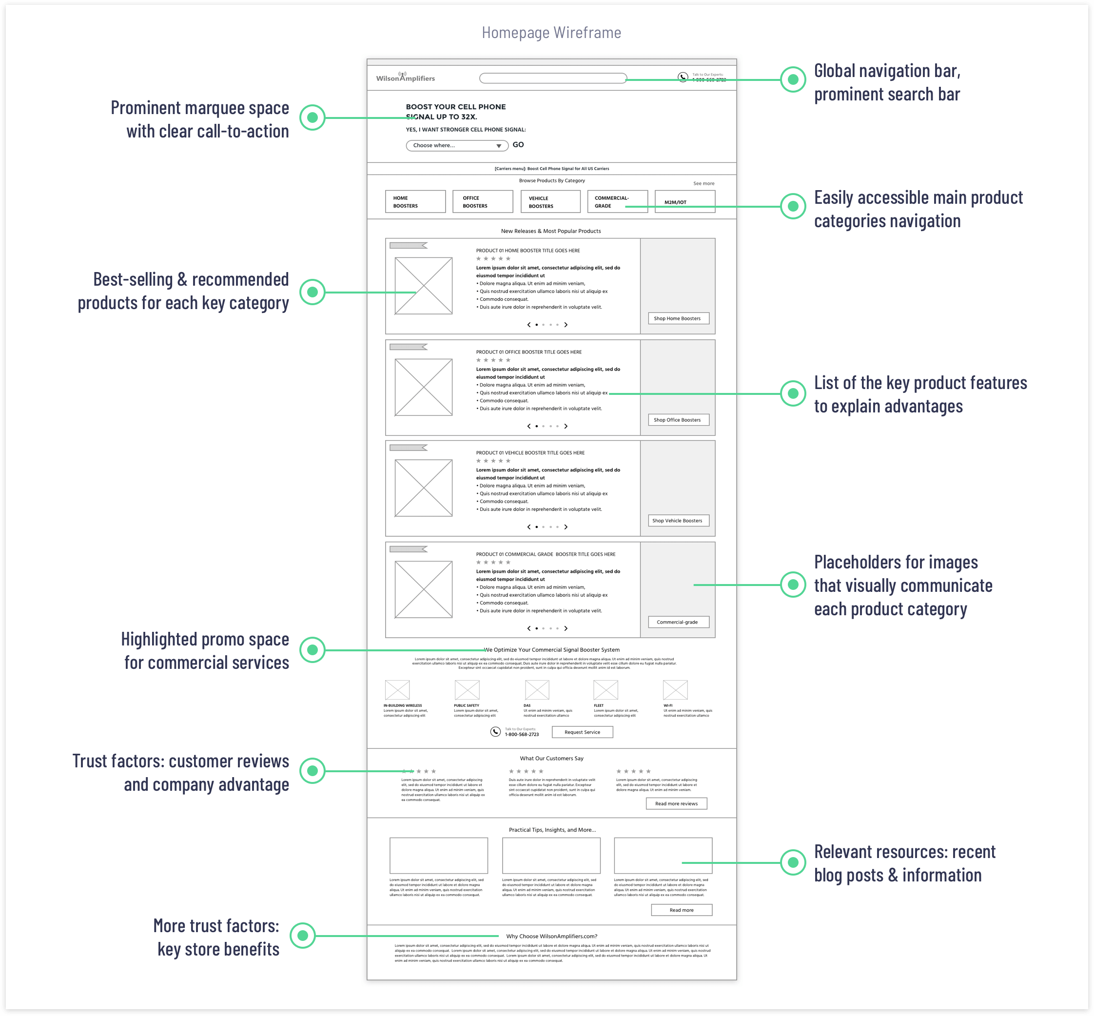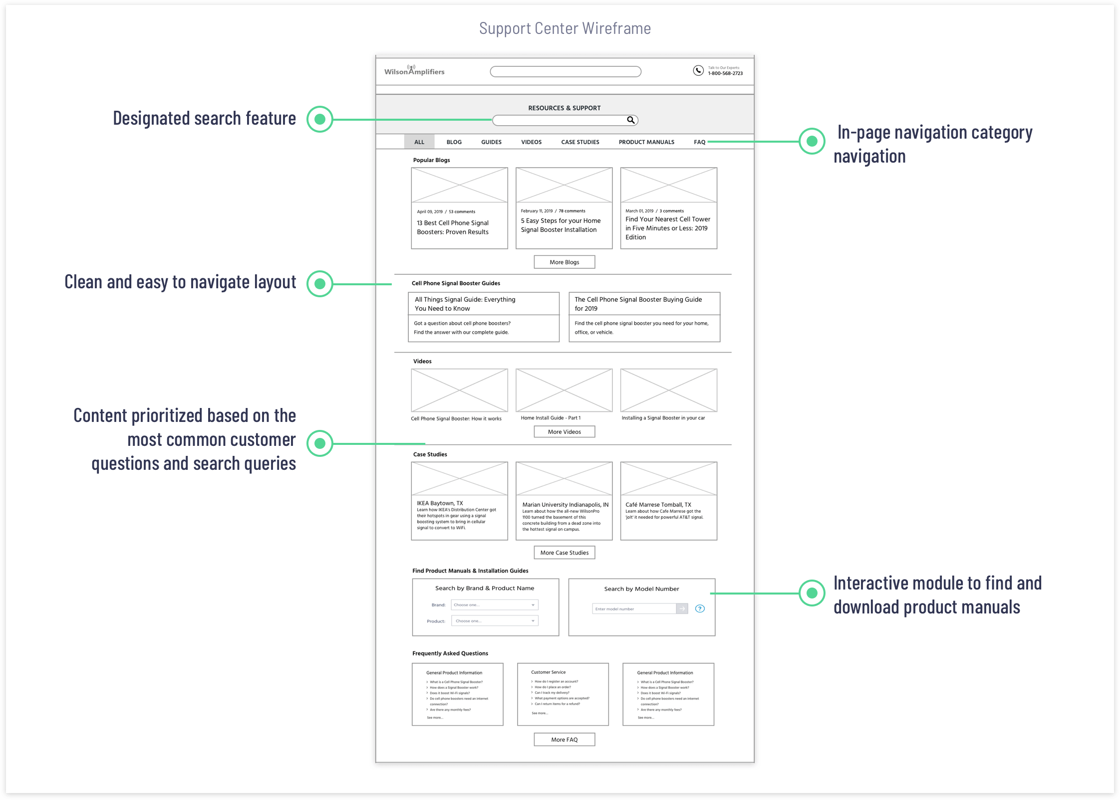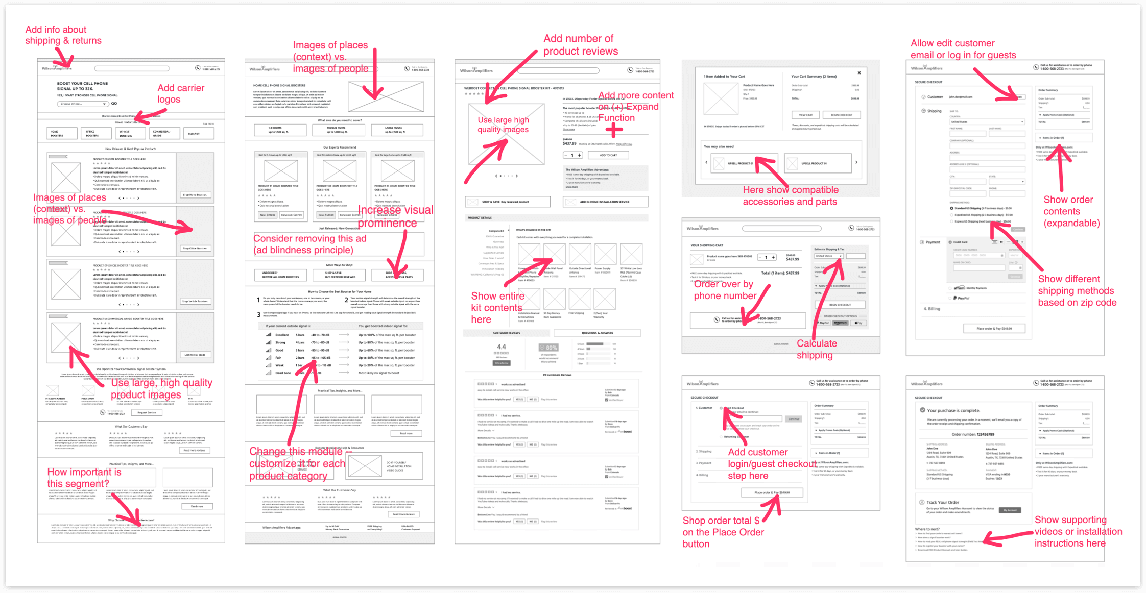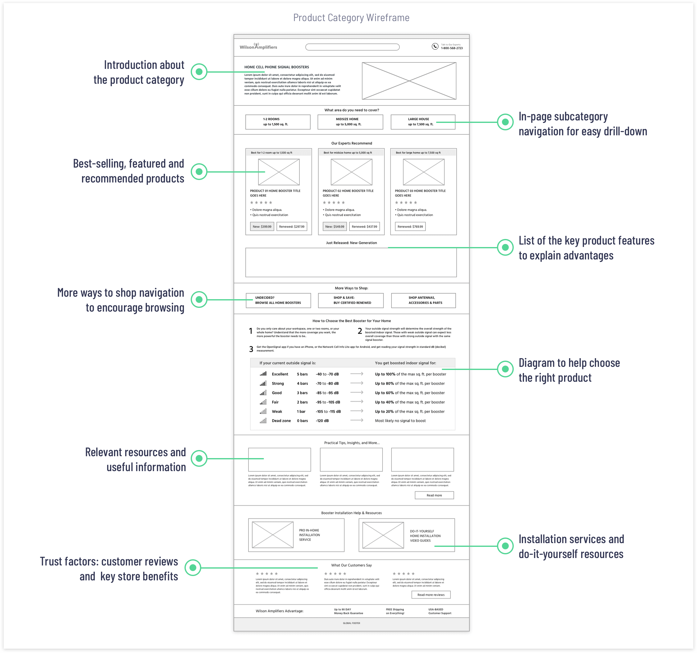 A series of kick-off meetings with the stakeholders helped me to understand the business objectives and the company’s values, such as excellent customer service, reliable products, and competitive pricing. One of the key goals was to minimize the number of calls to the call center. Customers should be able to easily find and choose the right product based on required cell phone signal coverage capacity and effortlessly complete the purchase online.