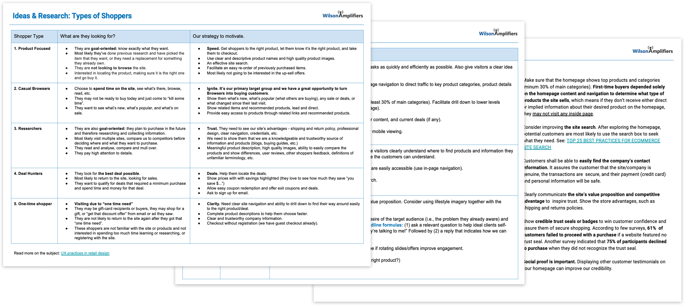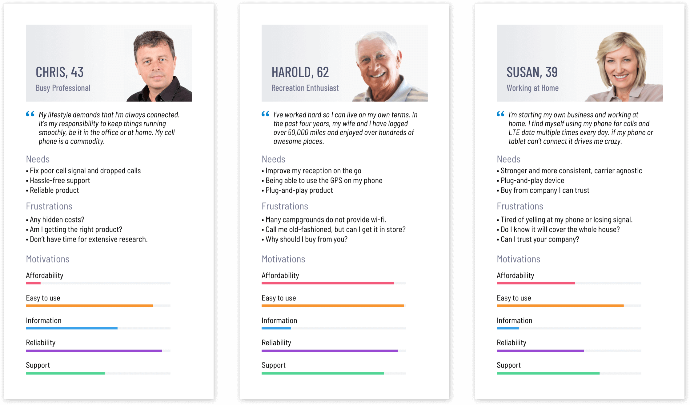 I identified several customer groups and created primary personas that encompassed the needs of each target audience. This helped me to visually communicate the customers’ motivations, frustrations, desires, and concerns to the stakeholders.